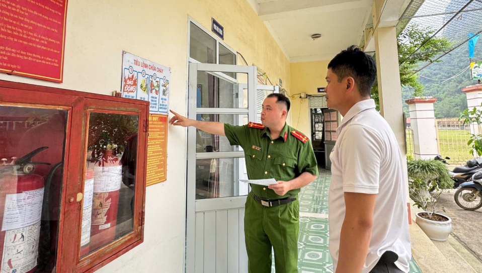Cán bộ Công an xã cùng với Cán bộ Phòng Cảnh sát PCCC&CNCH kiểm việc duy trì hoạt động của hệ thống báo cháy tại Trường Mầm non trên địa bàn