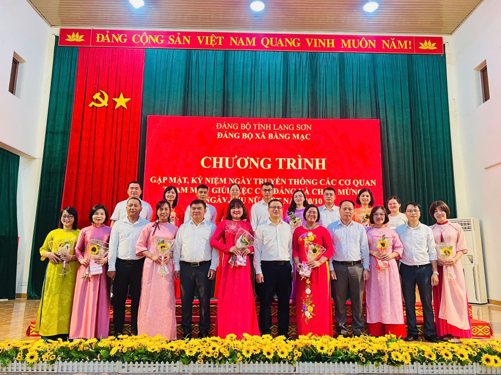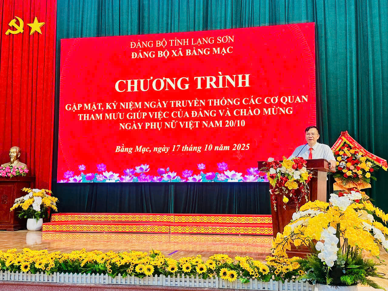 Chiều ngày 17/10/2025, tại Hội trường Đảng ủy xã Bằng Mạc, Đảng ủy - HĐND - UBND - Ủy ban MTTQ Việt Nam xã long trọng tổ chức Chương trình gặp mặt kỷ niệm Ngày truyền thống các cơ quan tham mưu, giúp việc của Đảng và chào mừng 95 năm Ngày thành lập Hội Liên hiệp Phụ nữ Việt Nam (20/10/1930 – 20/10/2025).