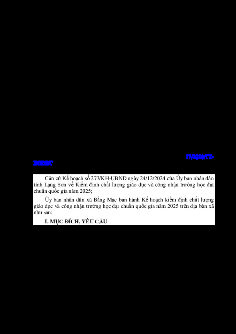 | Tiêu đề văn bản | Kế hoạch Kiểm định chất lượng giáo dục và công nhận trường học đạt chuẩn quốc gia năm 2025 trên địa bàn xã Bằng Mạc | ||