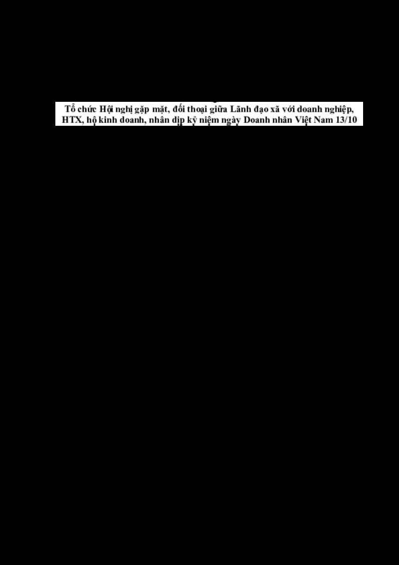 | Tiêu đề văn bản | Kế hoạch tổ chức Hội nghị gặp mặt, đối thoại giữa Lãnh đạo xã với doanh nghiệp, HTX, hộ kinh doanh, nhân dịp kỷ niệm ngày Doanh nhân Việt Nam 13/10 | ||