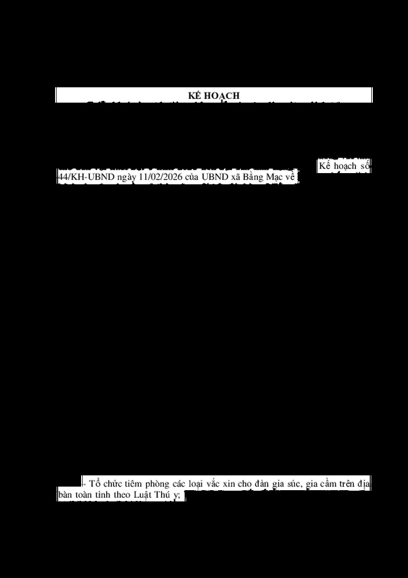 | Tiêu đề văn bản | Kế hoạch Triển khai công tác tiêm phòng vắc xin cho đàn vật nuôi đợt 1 năm 2026 trên địa bàn xã Bằng Mạc | ||