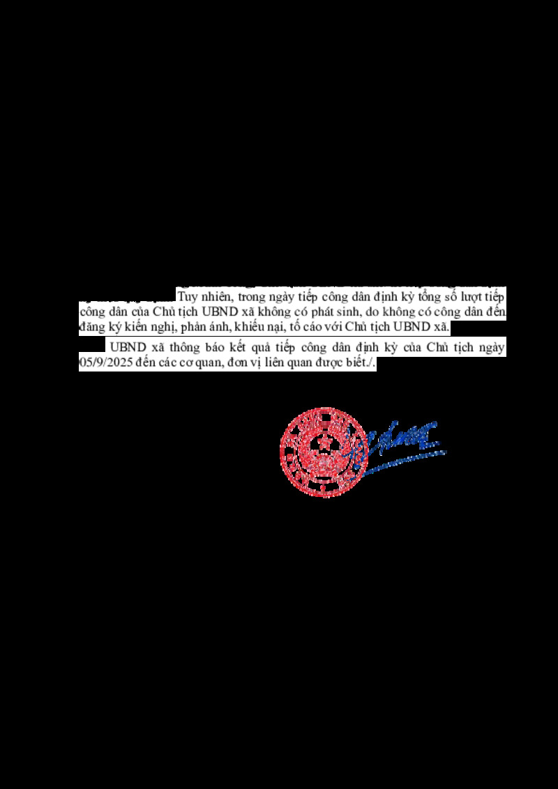 | Tiêu đề văn bản | Kết quả tiếp công dân định kỳ ngày 05/9/2025 của Chủ tịch UBND xã Bằng Mạc | ||