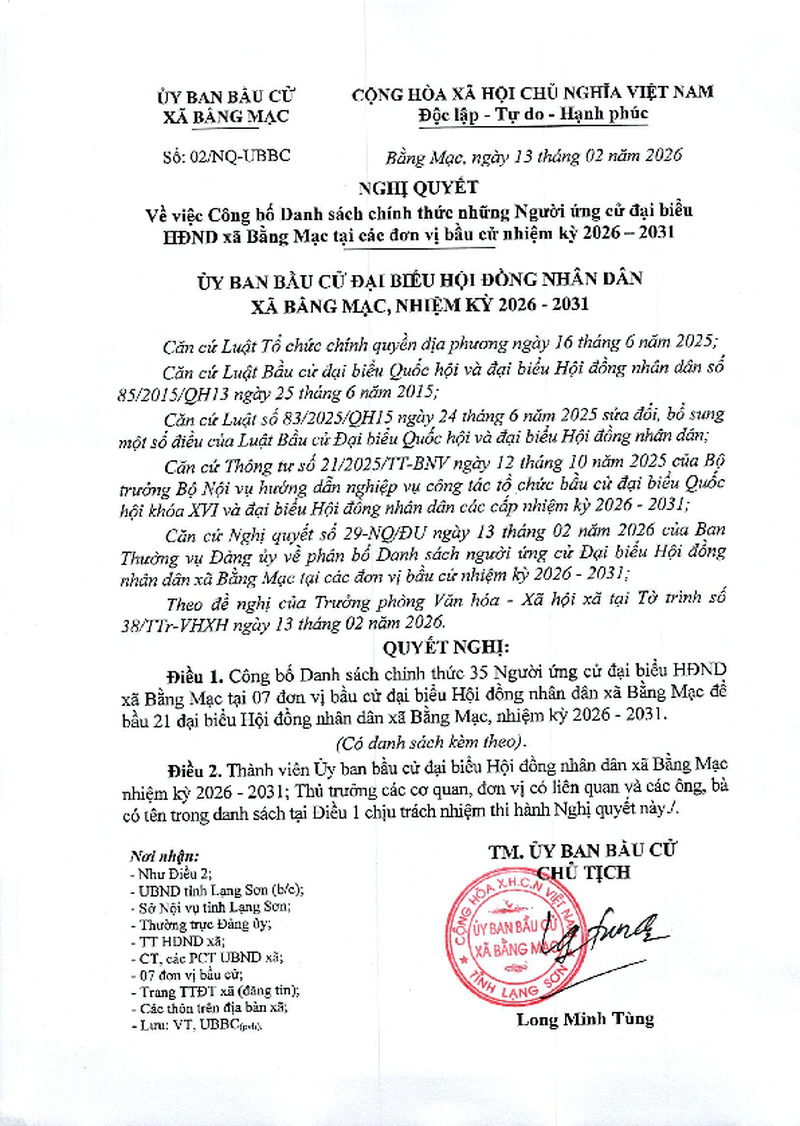 | Tiêu đề văn bản | NGHỊ QUYẾT Về việc Công bố Danh sách chính thức những Người ứng cử đại biểu HĐND xã Bằng Mạc tại các đơn vị bầu cử nhiệm kỳ 2026 – 2031 | ||
