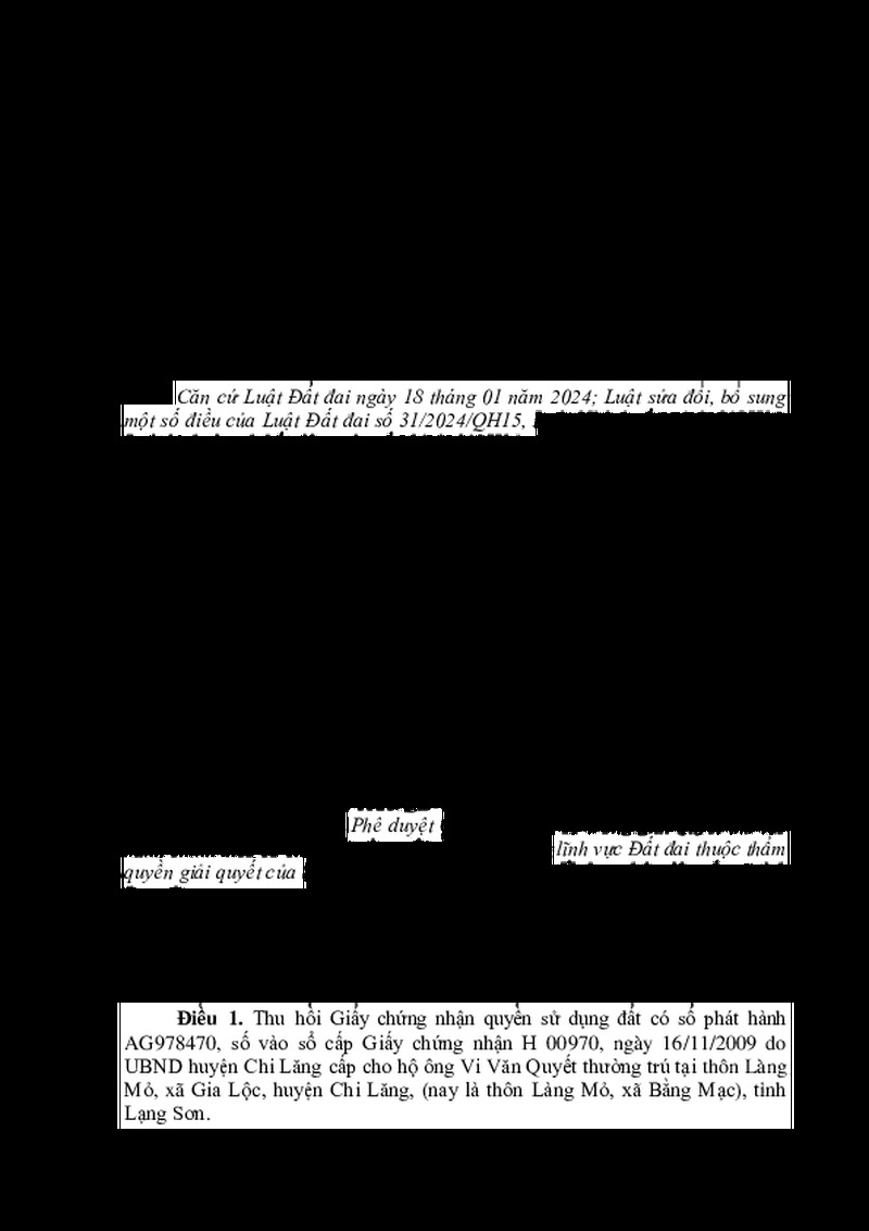 | Tiêu đề văn bản | QĐ Về việc thu hồi Giấy chứng nhận quyền sử dụng đất cấp không đúng quy định Ông Vy Văn Tròn | ||