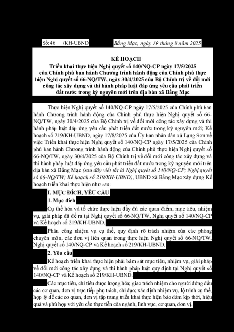 | Tiêu đề văn bản | Triển khai thực hiện NQ số 140/NQ-CP thực hiện NQ số 66-NQ/TW trên địa bàn xã Bằng Mạc | ||