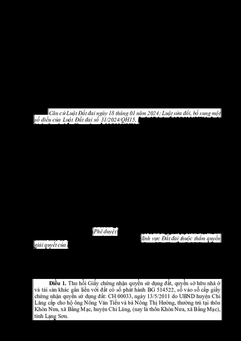 | Tiêu đề văn bản | Về việc thu hồi Giấy chứng nhận quyền sử dụng đất cấp không đúng quy định hộ ông Nông Văn Tiếu | ||