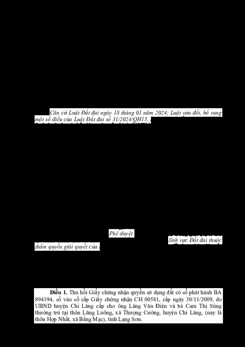 | Tiêu đề văn bản | Về việc thu hồi Giấy chứng nhận quyền sử dụng đất của ông Lăng Văn Điện và bà Cam Thị Súng | ||