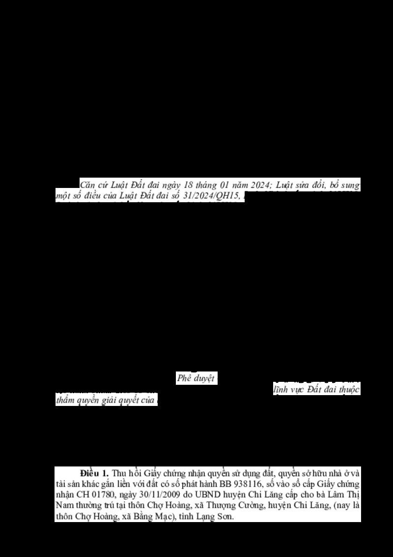 | Tiêu đề văn bản | Về việc thu hồi Giấy chứng nhận quyền sử dụng đất, quyền sở hữu nhà ở và tài sản khác gắn liền với đất cấp không đúng quy định (Lâm Thị Nam) | ||